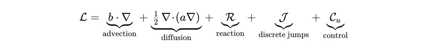 Advection and diffusion live where they belong, on Ω or on a graph that represents contact. R encodes stoichiometric chemistry with correct units. J handles discrete jumps such as promoter switching or fate change. C_u injects inputs, light pulses, drugs, mechanical stimuli. Densities evolve by the forward equation