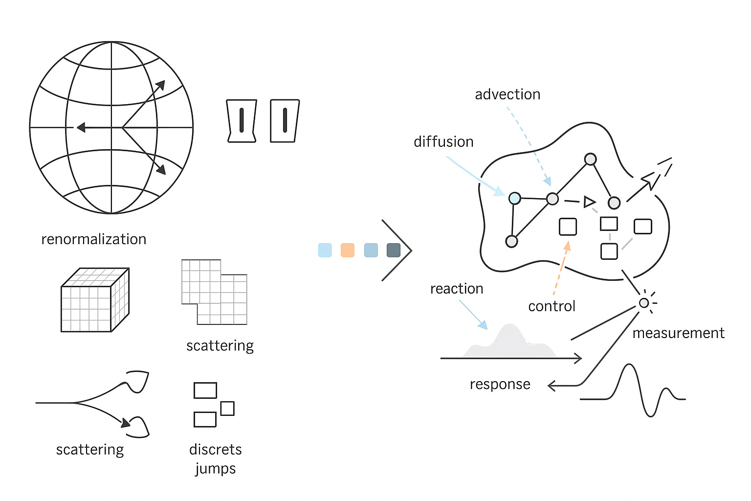 Or look at morphogenesis on a cellular graph. The adjacency enters through a Laplacian or a nonlocal kernel. Reaction terms come from a Jacobian that respects stoichiometry. Pattern selection and stability are spectral questions of a block operator that couples transport on the graph with the reaction block. Coarse-grain by graph contraction and spatial averaging to get an effective generator on a simpler domain. Track parameter flow with scale